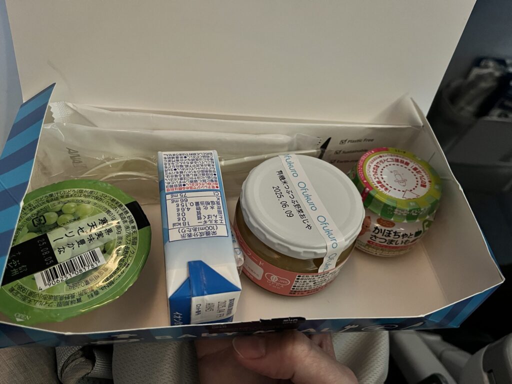 帰りのフライトは昼便で起きていたので、離陸時は授乳。その後はご飯を食べたり昼寝をしたり、起きた後は持参したおもちゃやおやつ、座席モニターや機内でもらったおもちゃ、抱っこで過ごしました。