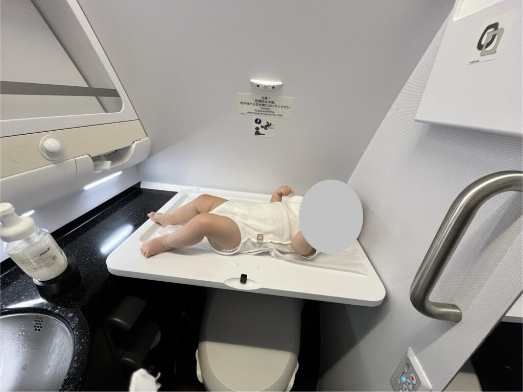 おむつ交換のできるトイレが限られており、揺れる機内かつスペースも狭いため大変交換しにくいです💦